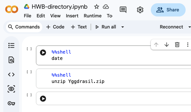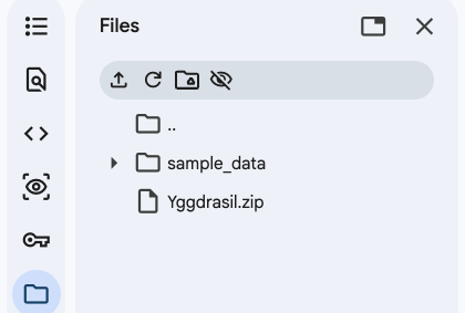Yggdrasil.zip を colab にアップロードしてください.まず手元にダウンロードして,それからアップロードすると良いでしょう.(ユグドラシルと読んでください)