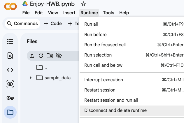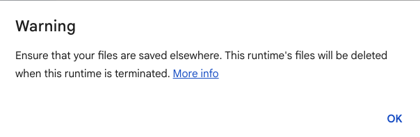 Colab のファイルシステムのファイル (アップロードしたファイルや,作成したファイル) は,この操作では保存されません. 必要に応じて,ダウンロードしたり,Google drive に移動したりして,個別に保存する必要があります.