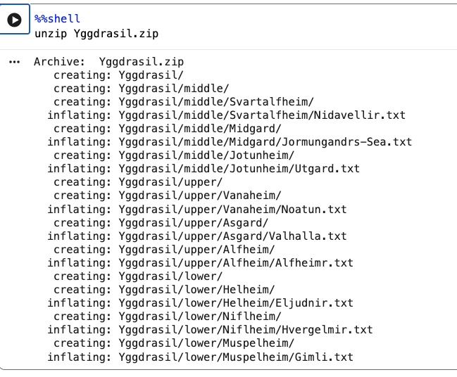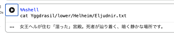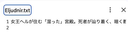 ノートブックの2つ目のセルの実行ボタンを押して,unzip でファイルを取り出してみましょう.Eljudnir.txt を読んで見ましょう.