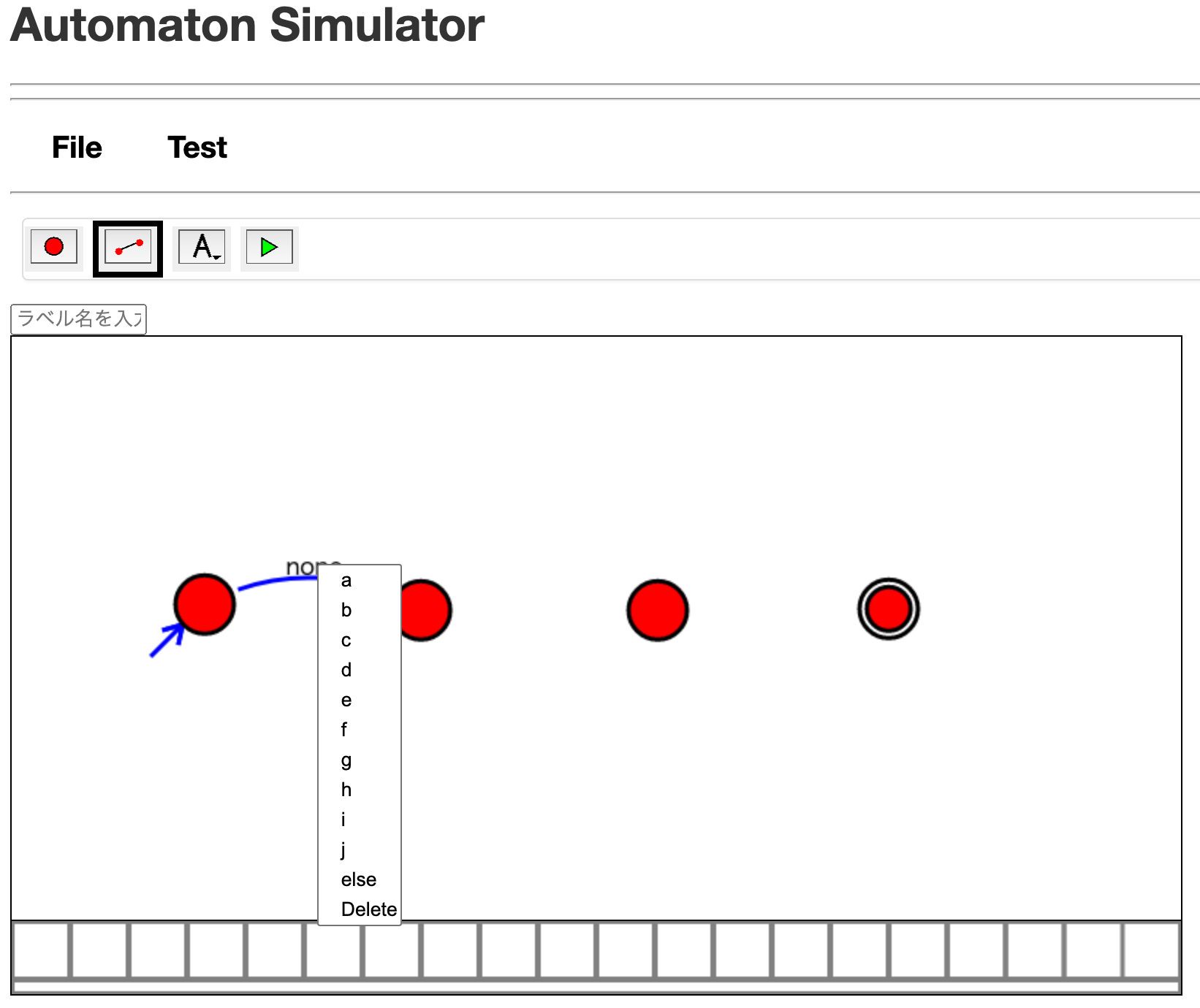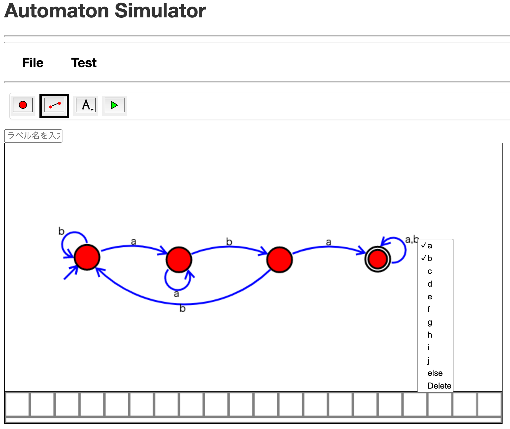 をクリックした後,「元の状態」から「次の状態」までドラッグします.すると,状態間に青色の矢印が引かれ none と表示されます.none と書かれた所を右ボタンでクリックすると,a, b, ..., j, else, Delete というメニューが出るので,入力文字を選びます.else は「他の文字全て」を意味します.状態や状態遷移の規則を削除するには,それぞれの上で右ボタンをクリックして Delete を選択します.すべてを消して最初から始める場合には,FileメニューのNew -> Deterministic Finite Automatonを選択するか,ブラウザのリロードボタンを押すと良いでしょう(前者の場合,「Are you sure you want to clear everything for a new project?」と聞かれるので「OK」を選択します).