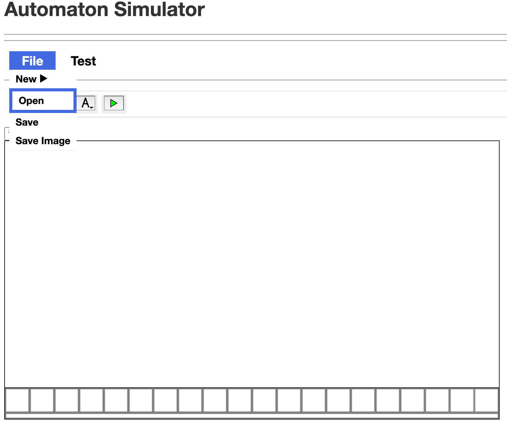 作成したオートマトンは「File」メニューの「Save」で保存したり,「Save Image」で画像として保存したりできます.前者の場合,ダウンロードディレクトリに「machine.txt」という名前で,後者の場合には同じくダウンロードディレクトリに「automaton.png」という名前で保存されます.