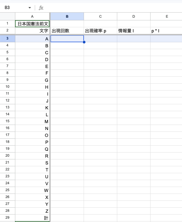 各文字の出現回数を,準備で開いたシートに入力してください. B列の B3 から B28 に数を入れます.まとめてコピーして,B3にペーストするとだいたいうまくいきます.
