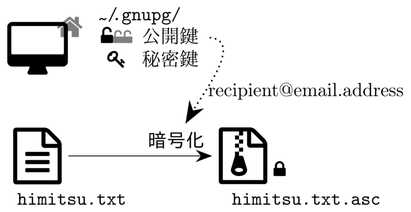 暗号化は,gpg -r emailaddress -ea というコマンドを使います.