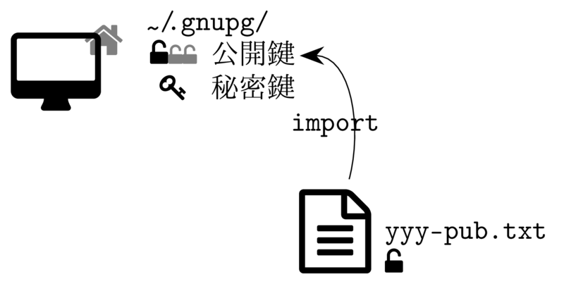 公開鍵が書かれたファイルから,その鍵を登録するためには,gpg --import コマンドを用います.
