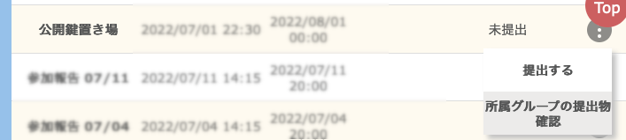 UTOL の課題「公開鍵暗号置き場」から,友達の公開鍵をダウンロードします.課題一覧の画面で該当課題の右端の縦の3点 (⋮) をクリックしてメニューを開き「所属グループの提出物確認」に進みます.