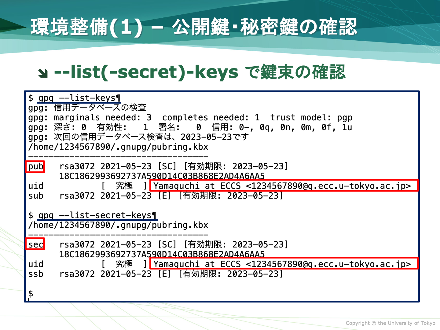 $ はプロンプトの意図で,gpg からタイプしてください(以下も同じ).emailaddress は鍵ペア作成時に登録した電子メールアドレス,studentidの部分は各自の学生証番号で置き換えてください.